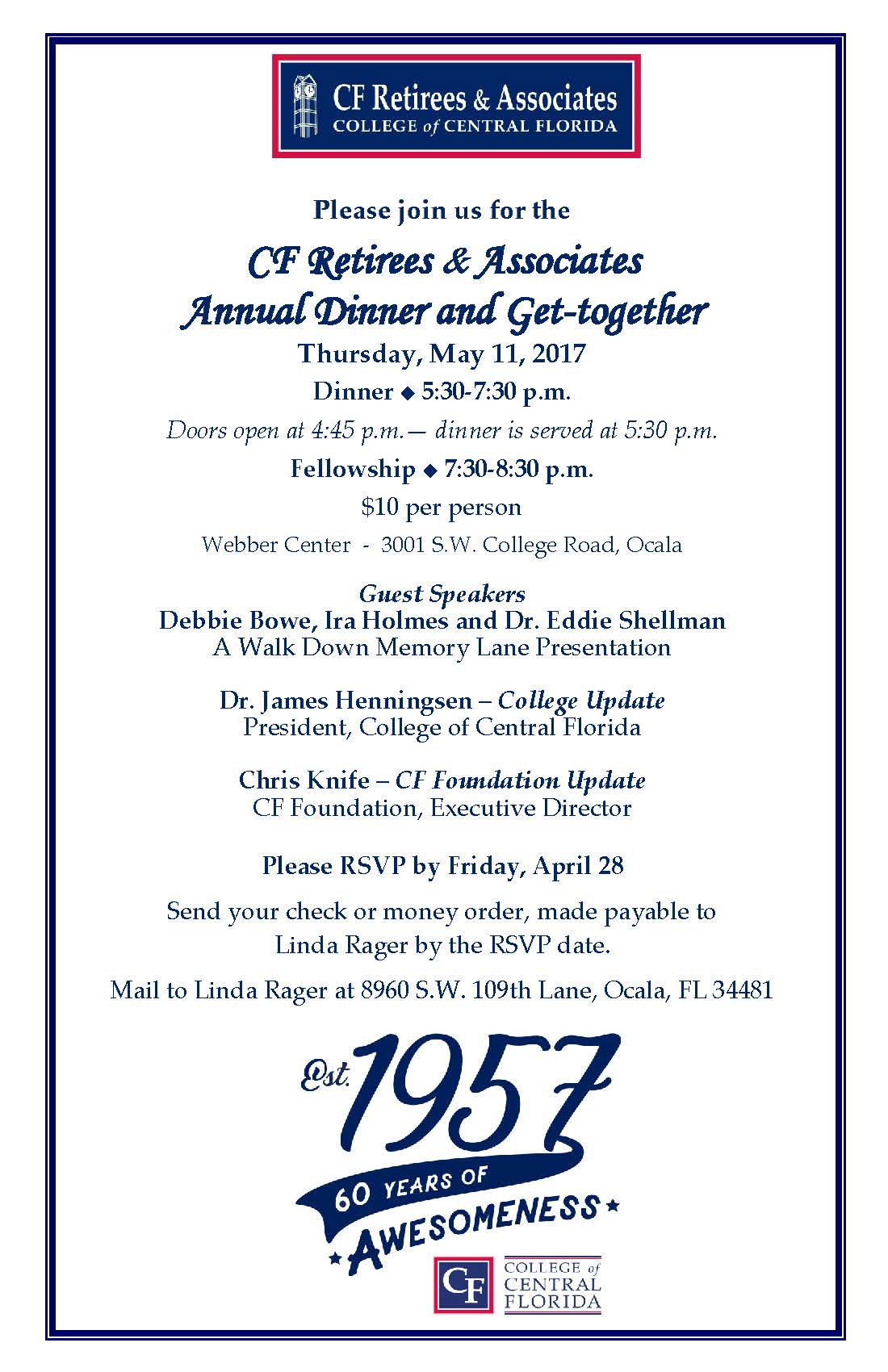 The annual CF Retirees and Associates Dinner will be held Thursday, May 11, from 5:30-7:30 p.m. at the Webber Center. The deadline to RSVP is April 28. Save Save
