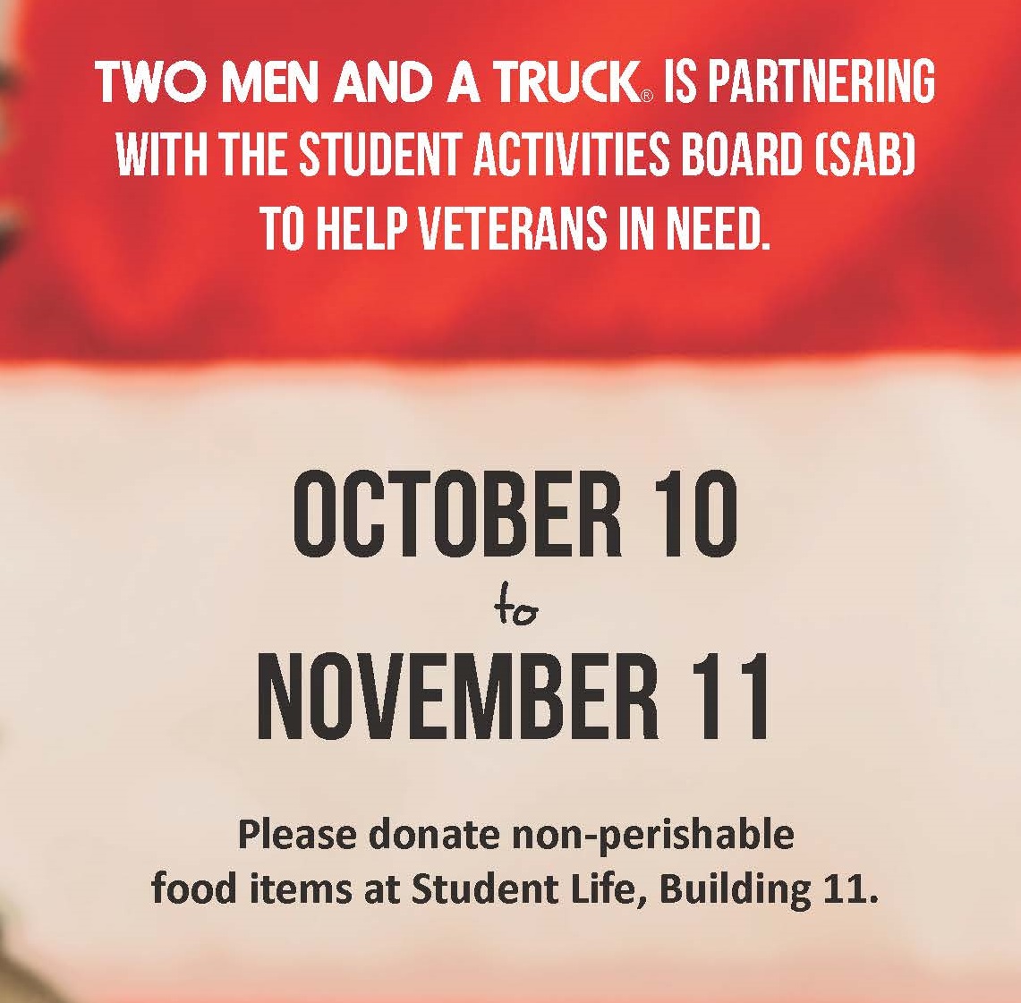 The Ocala Campus Student Activities Board is partnering with Two Men and a Truck for “Movers For Military.” Students are collecting nonperishable items to share with our local Veterans in … Read more