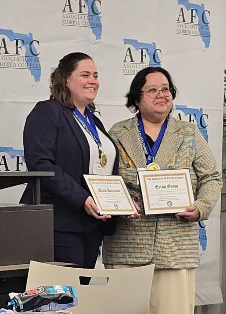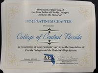 The chapter was given Platinum Award honors for all its hard work this past year. CF is part of region three along with Daytona State College, Eastern Florida State College, Lake-Sumter State College, Seminole State College of Florida and Valencia College. Our region won Region of the Year. Both Alicia Harrison and Erina Gross completed the yearlong Certified College Professional program. Thank you to everyone who attended! (see pictures below)