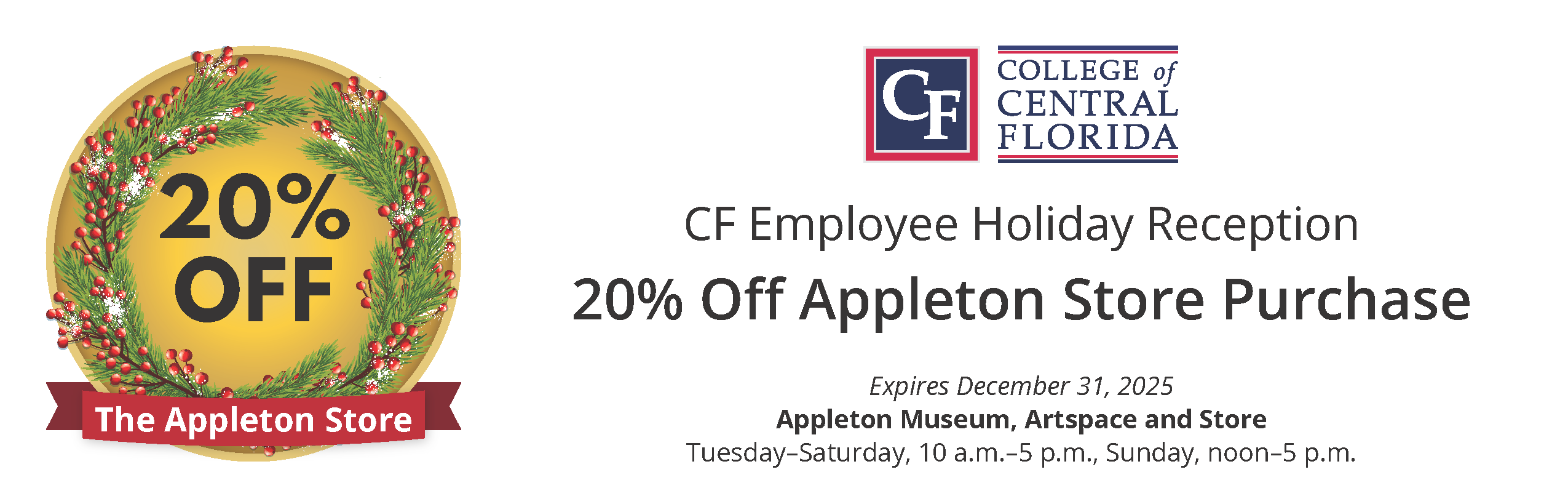 The Appleton Museum, Artspace and Store are open Tuesday-Saturday, 10 a.m.-5 p.m. and Sunday, noon-5 p.m. Learn more about the exhibitions and activities CF staff, faculty and students can enjoy free with CF ID at www.AppletonMuseum.com.
