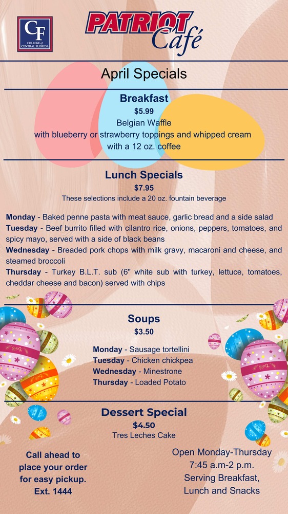 The café is open Monday-Thursday, 7:45 a.m.-2 p.m. Stop by or give them a call at ext. 1444 to place your order.