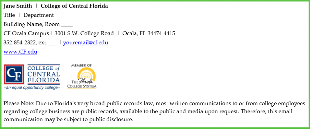 If you have any questions about the email signature standards, contact pr@cf.edu.