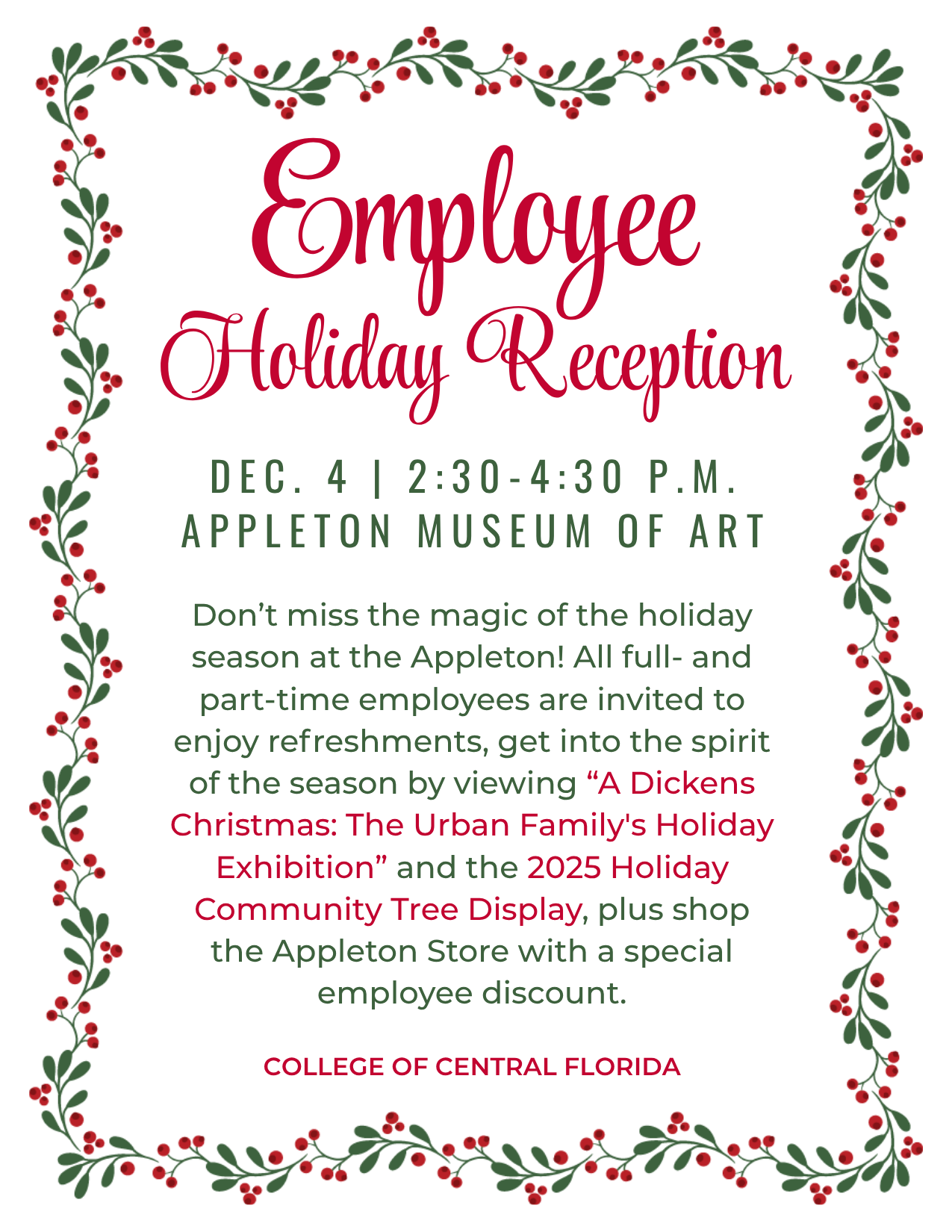 Don’t miss the magic of the holiday season at the Appleton! All full- and part-time employees are invited to the annual Employee Holiday Reception on Thursday, Dec. 4, 2:30-4:30 p.m. Please join us to enjoy refreshments, get into the spirit of the season by viewing “A Dickens Christmas: The Urban Family’s Holiday Exhibition” and the 2025 Holiday Community Tree Display, plus shop the Appleton Store with a special employee discount.