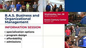 Encourage your students to join advisors, administrators and faculty, Wednesday, Jan. 28, 12:30-1:30 p.m., in Room 101 of Ewers Century Center, for an informational session about the Bachelor of Applied Science in Business and Organization Management. Learn about specialization options, program design, affordability and admissions.