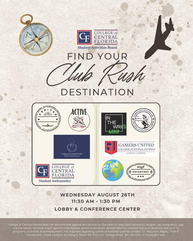 Faculty and staff, please encourage your students to attend Fall Club Rush on Wednesday, August 28, 11:30 a.m.-1:30 p.m., in the Charles S Dean Educational Center Conference Room, Building C-4, on the Citrus Campus. This event presents an opportunity for students to learn more about the various clubs offered on the Citrus Campus and become engaged with the CF’s student life.