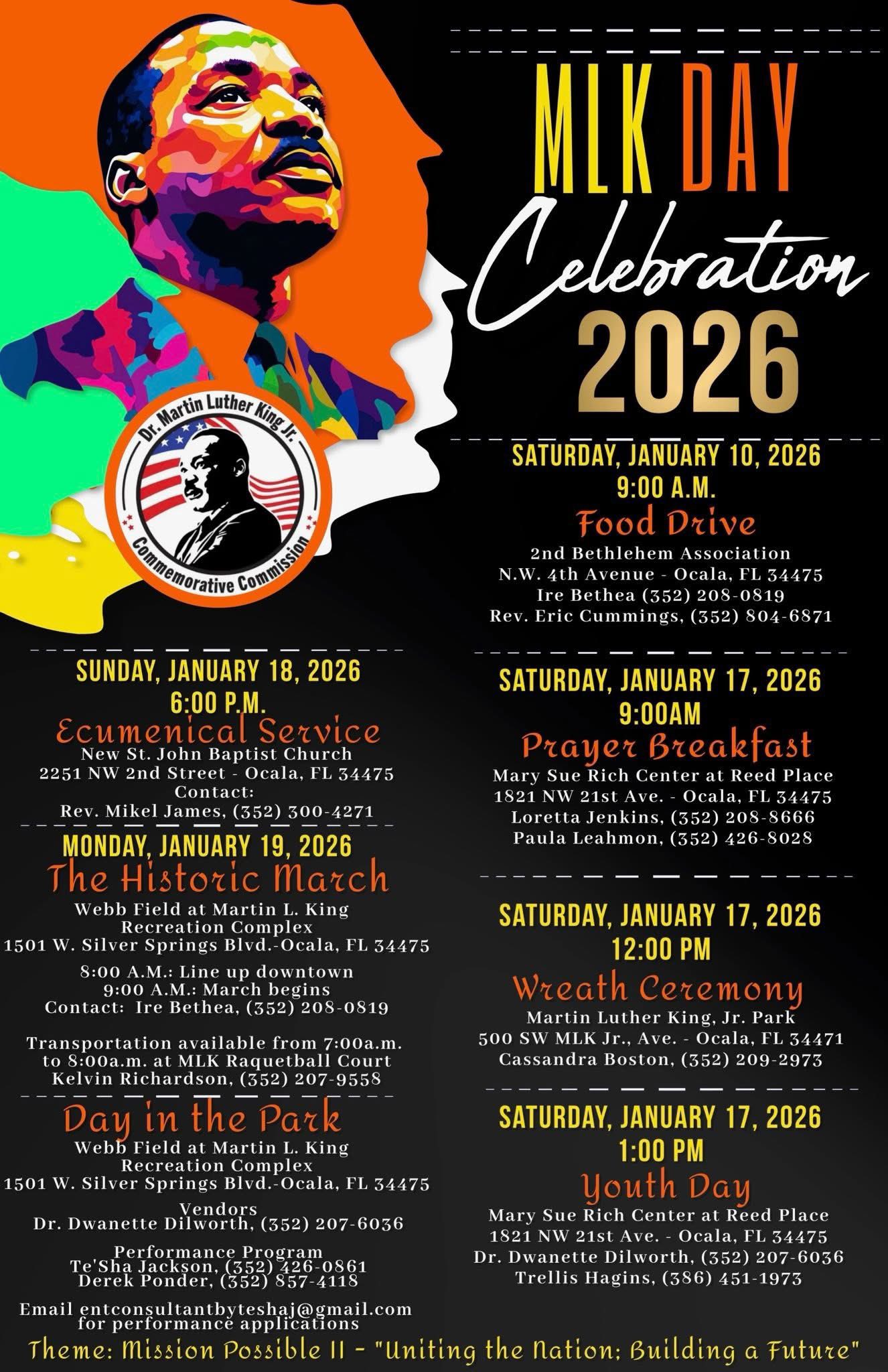 Please join us for Ocala’s annual walk and activities Monday, Jan. 19. The march from downtown to Webb Field at Martin Luther King Jr. Recreation Complex begins at 9 a.m. Lineup for the walk begins at 8 a.m. in downtown Ocala. The Day in the Park runs from 10 a.m-2 p.m. There will be activities, food and performances. If you are interested joining in the walk, please contact Kaitlyn Carter at carterk@cf.edu. Click here for a complete list of events for the weekend.