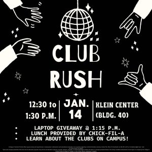 Faculty, have your students join us on Wednesday, Jan. 14 ,12:30 – 1:30 p.m. on the Ocala Campus in the Klein Center for Club Rush! They will get to meet and learn more about our CF clubs and organizations. And there will be FREE Chick-Fil-A sandwiches, a laptop giveaway at 1:15 p.m. and the first 200 students to check in will receive a CF tote and notebook.