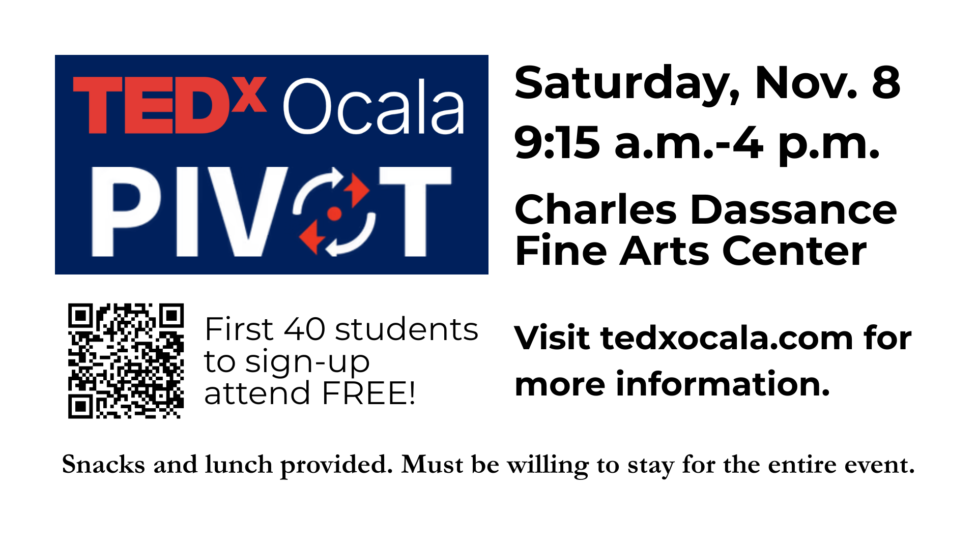 TEDxOcala is coming to the Dassance Fine Arts Center on Saturday, Nov. 8. The TEDxOcala coordinators have provided 40 tickets for CF students to attend for free. Please share the attached flyer with your students and encourage them to sign up. Registered attendees are expected to attend the entire event, from 9:15 a.m.-4 p.m. Snacks and lunch are provided.