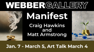 Join us on Wednesday, March 4, from 12:30 to 1:30 p.m. at the Webber Gallery for a Q&A with artists Craig Hawkins and Matt Armstrong, the “Manifest” exhibiting artists. The duo will share insights into their creative processes and artistic perspectives. This talk will offer visitors the unique opportunity to gain a better understanding of their work and why both Craig and Matt decided to tour together.