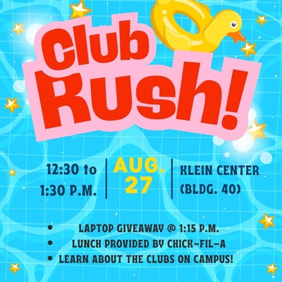 Encourage your students to join us Wednesday, Aug. 27, 12:30-1:30 p.m., in the Klein Center for Club Rush! There will be over 30 student groups to check out. One lucky student will win a laptop! Lunch provided by Chick-Fil-A while supplies last. The first 200 students will receive a CF branded tote and a notebook. ... Read more