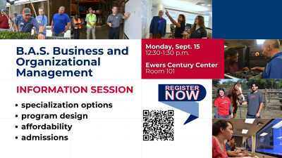 Encourage your students to join advisors, administrators and faculty, Monday, Sept. 15, 12:30-1:30 p.m., in Room 101 of Ewers Century Center, for an informational session about the Bachelor of Applied Science in Business and Organization Management. Learn about specialization options, program design, affordability and admissions. Registration is required. Topics and concepts presented at this event are ... Read more