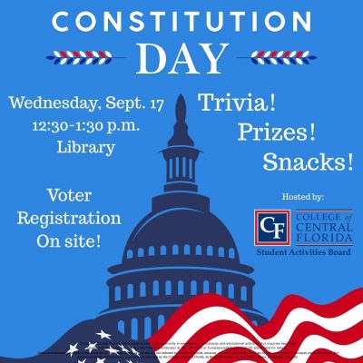 Faculty and staff, please encourage your students to join SAB for Constitution Day and Voter Registration Wednesday, Sept. 17, 12:30-1:30 p.m. in the Stearns Learning Resources Center on the Ocala Campus. Not only can they register to vote, but there will also be trivia and prizes. Please remember events sponsored by the Student Activities Board ... Read more