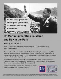 Transportation will be provided from the Dr. Martin Luther King Jr. Complex parking lot to the Ocala Downtown Square. The complex is adjacent to the Hampton Center parking lot, 1501 W. Silver Springs Blvd. Day in the Park activities start immediately following the parade at the Dr. Martin Luther King Jr. Complex.
