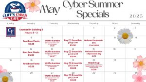 Summer Fun with Cliff’s Cyber Café May 2, 2025 by Shanna Holloway A new summery special for each day of the week in May. Click on the image to view a larger version.
