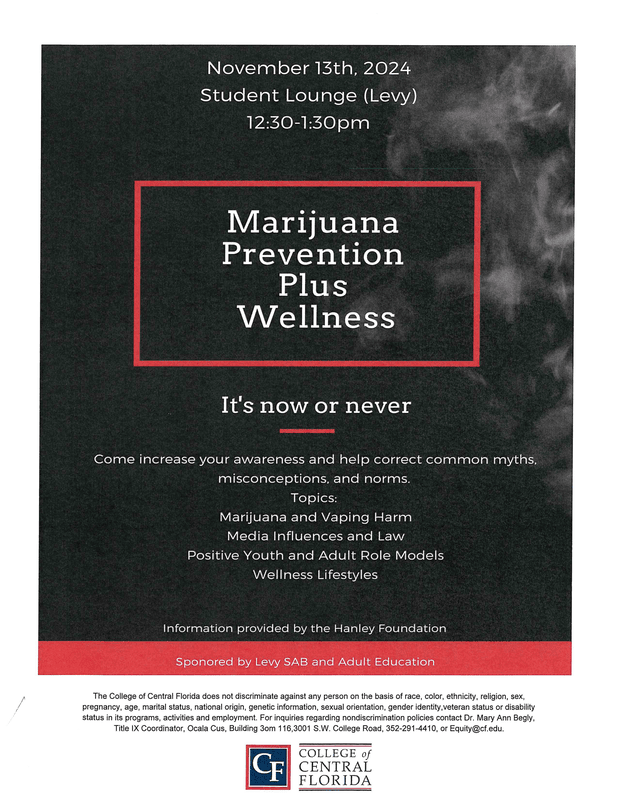 Faculty and staff, please encourage your students to join the Levy SAB and Adult Education Wednesday, Nov. 13, 12:30-1:30 p.m. in the Levy Student Lounge for ‘Marijuana Prevention Plus Wellness’ … Read more