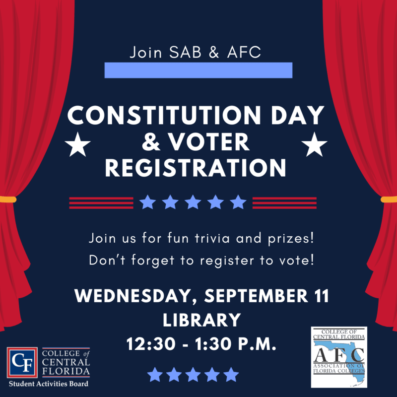 Faculty and staff, please encourage your students to join SAB and AFC for Constitution Day and Voter Registration Wednesday, Sept. 11, 12:30-1:30 p.m. in the Stearns Learning Resources Center on … Read more