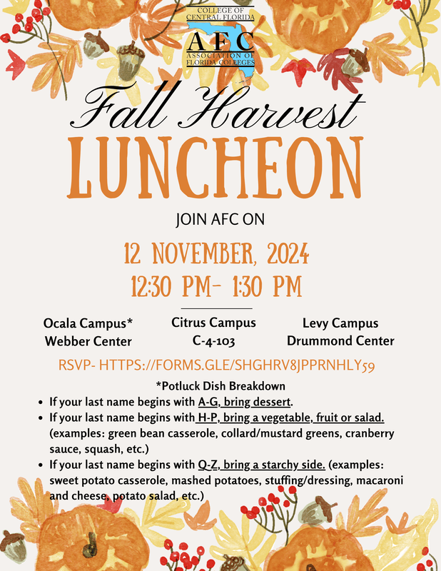 Please join us for the AFC Harvest Potluck at the Webber Center on Tuesday, Oct. 24, from 12:30-1:30 p.m. Ocala attendees can RSVP by Oct. 9 at the following link: https://www.surveymonkey.com/r/XRJLVB3. … Read more